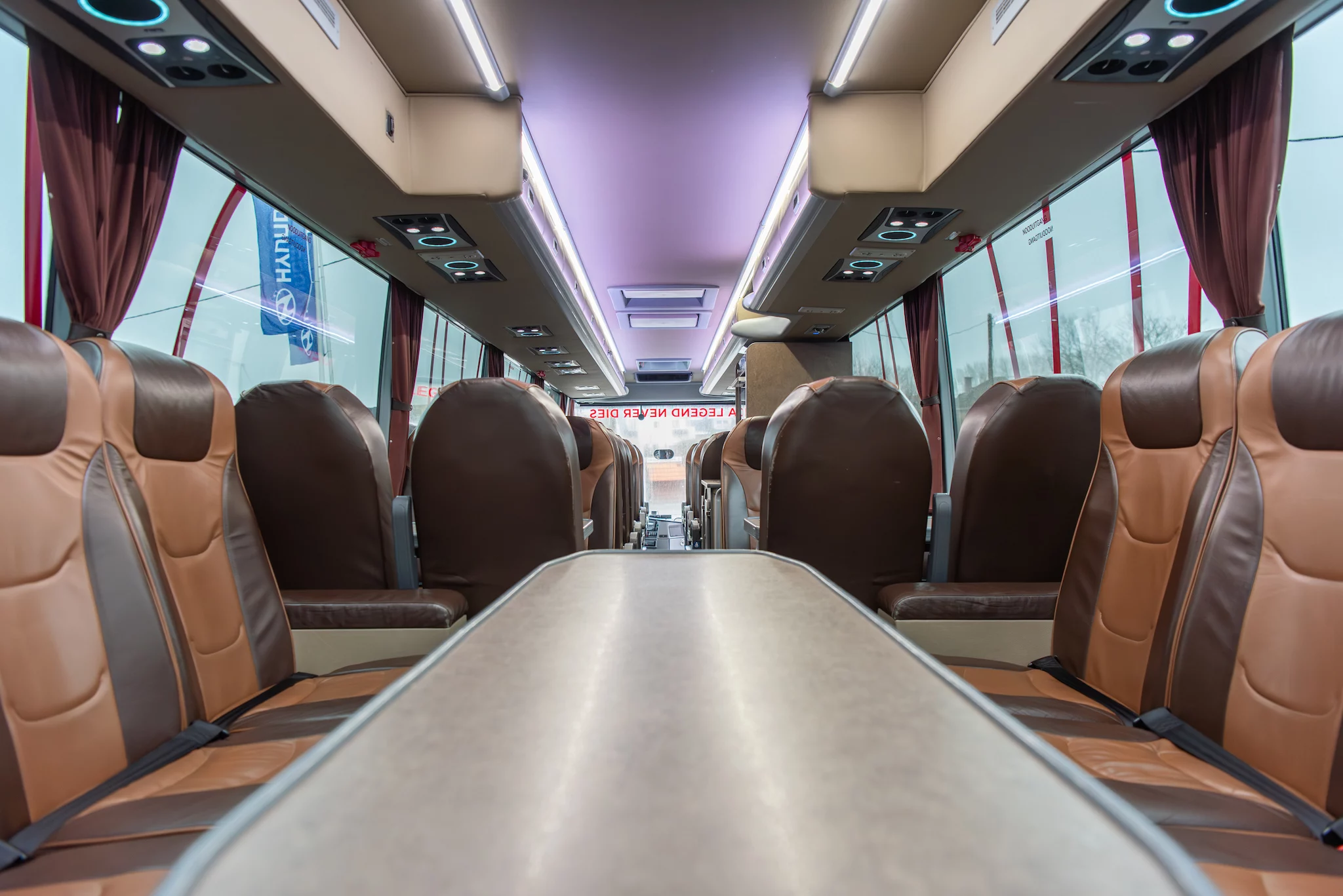 38 lederen stoelen Grand Luxe met verstelbare rugleuning, zijdelings verstelbaar, klaptafeltjes en lectuurnetjes, voetsteunen (30 plaatsen in bustronomie uitvoering)